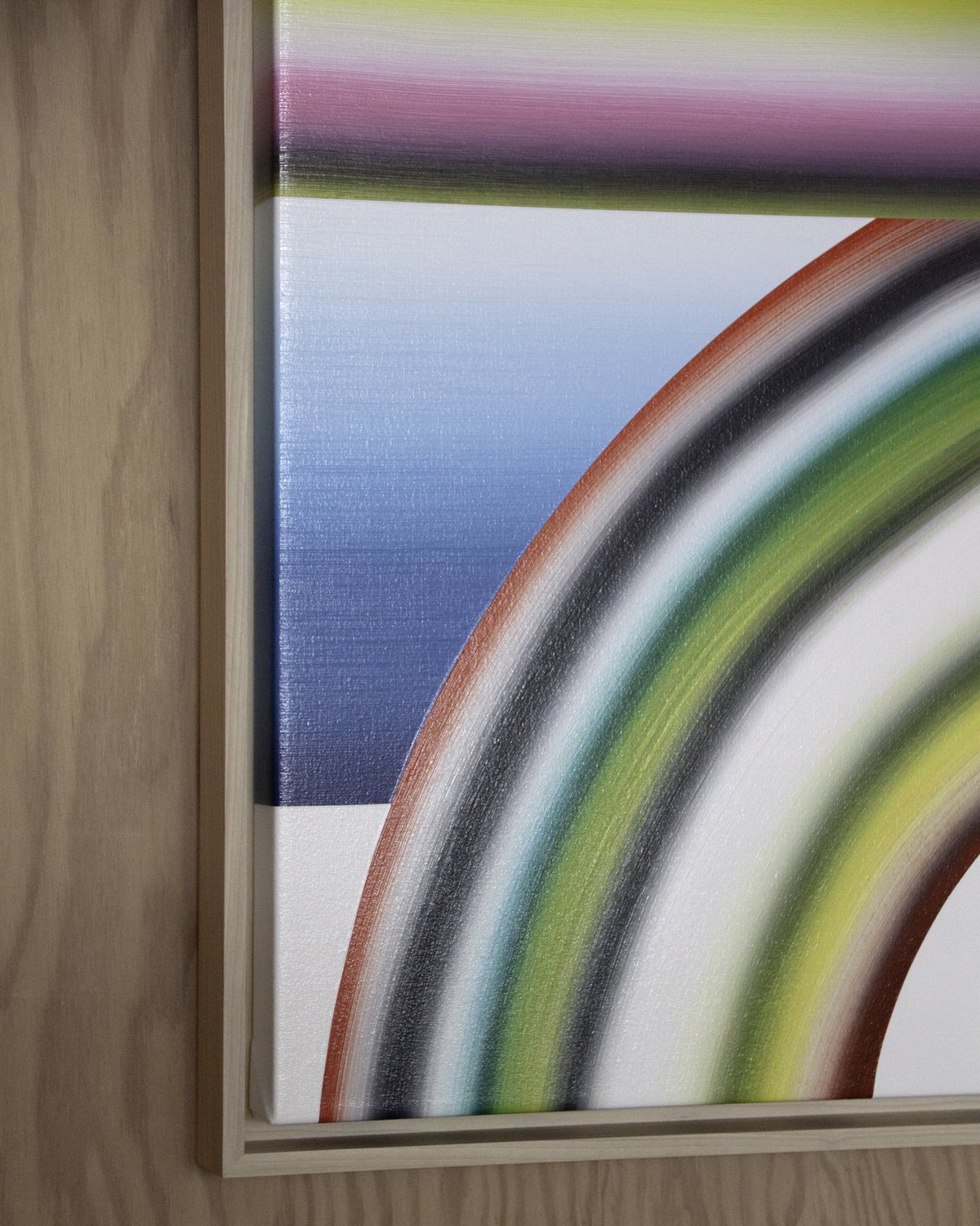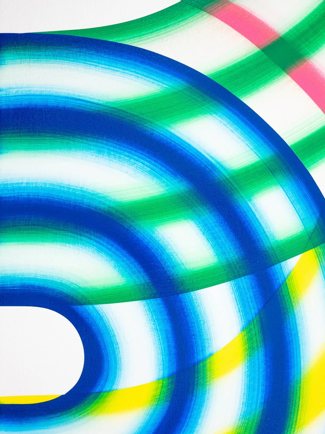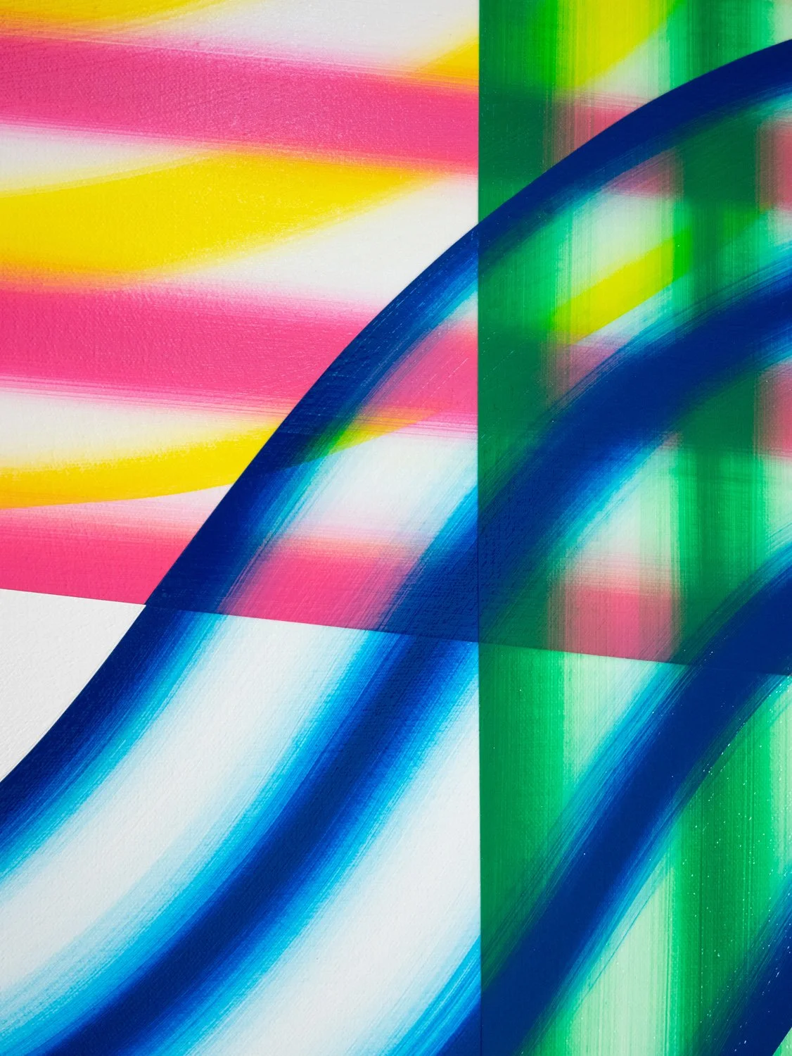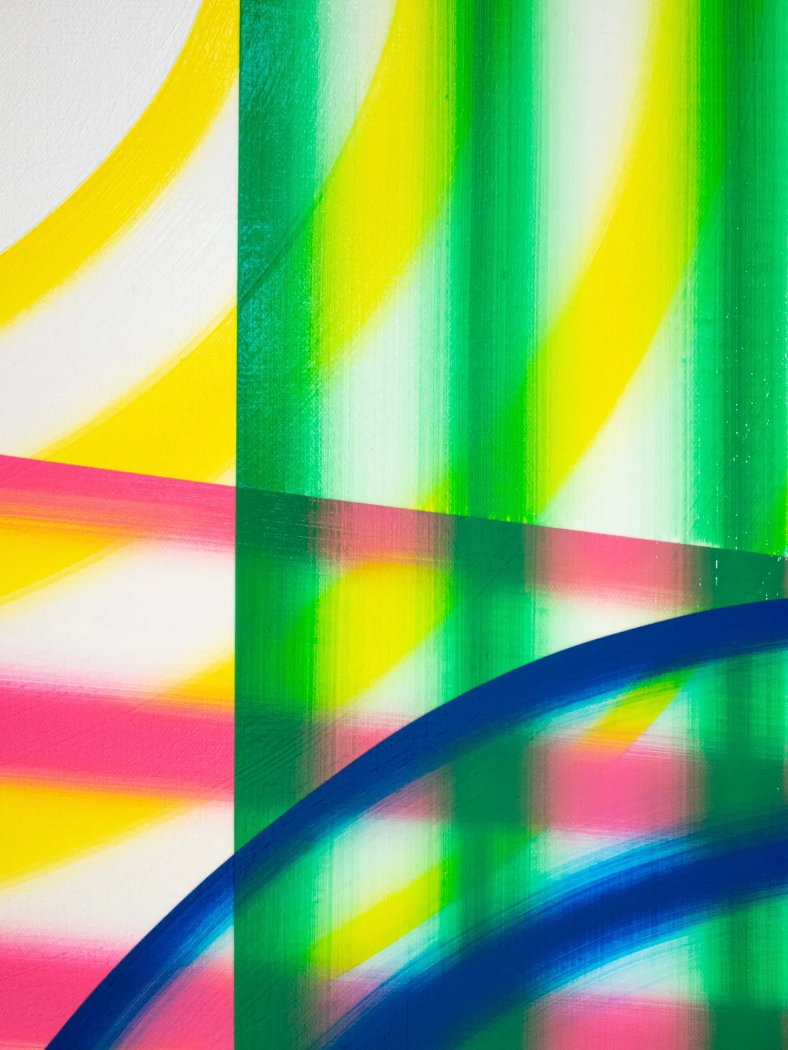 I’m drawn to forms that imply movement without depicting it directly: arcs, bands, and repeated linear structures that generate both rhythm and restraint. While each composition may begin with a loose framework, the process is largely intuitive and responsive. Decisions are guided by the behavior of color, how it absorbs, reflects, and vibrates in relation to surrounding tones.