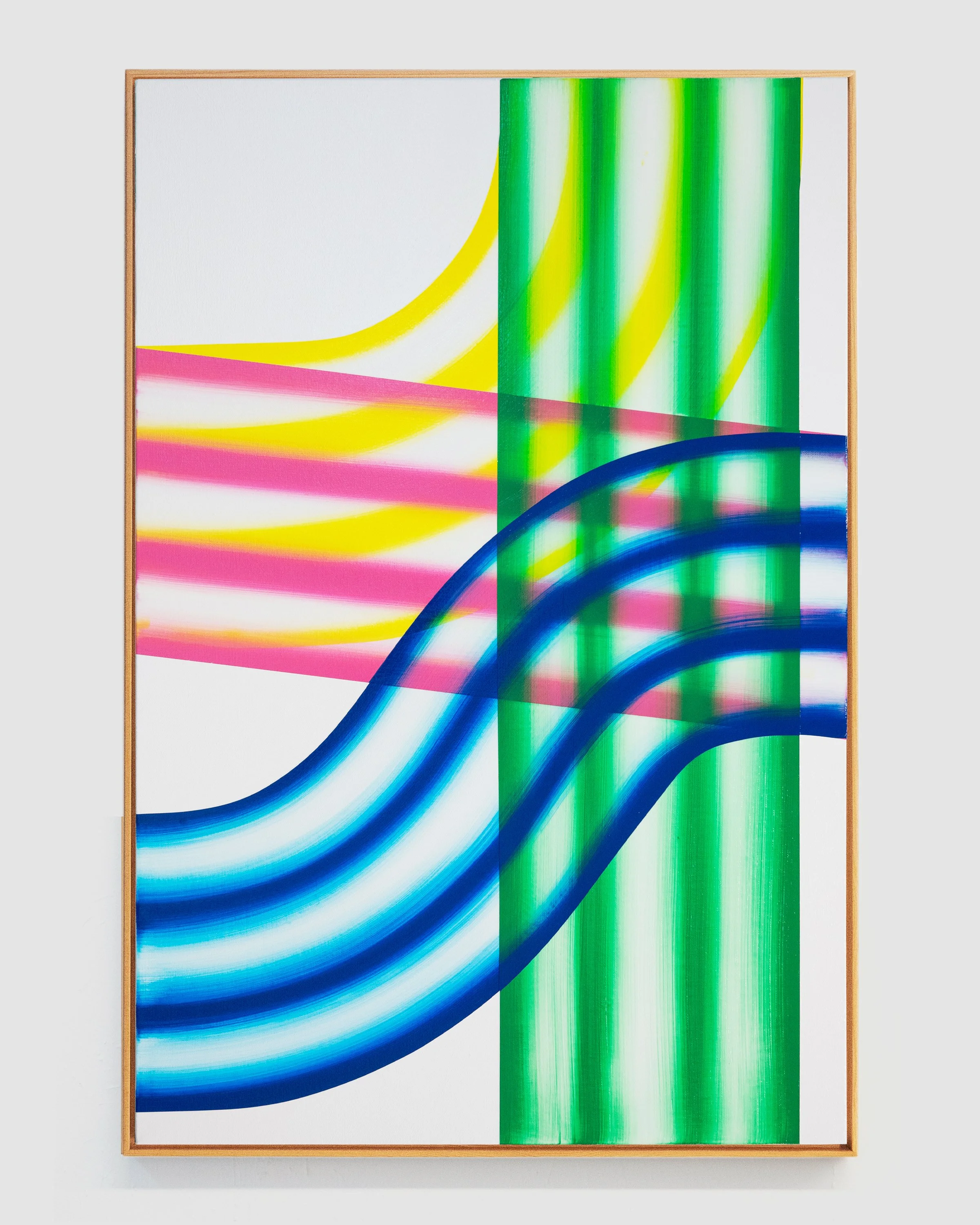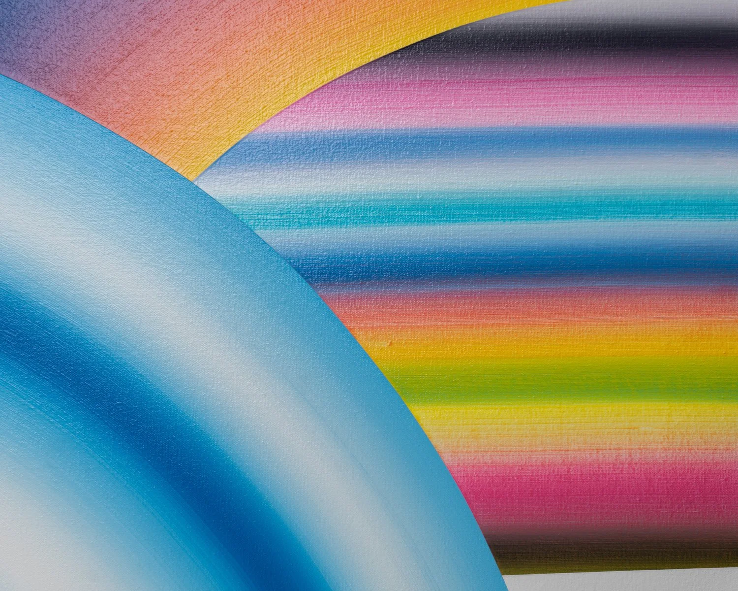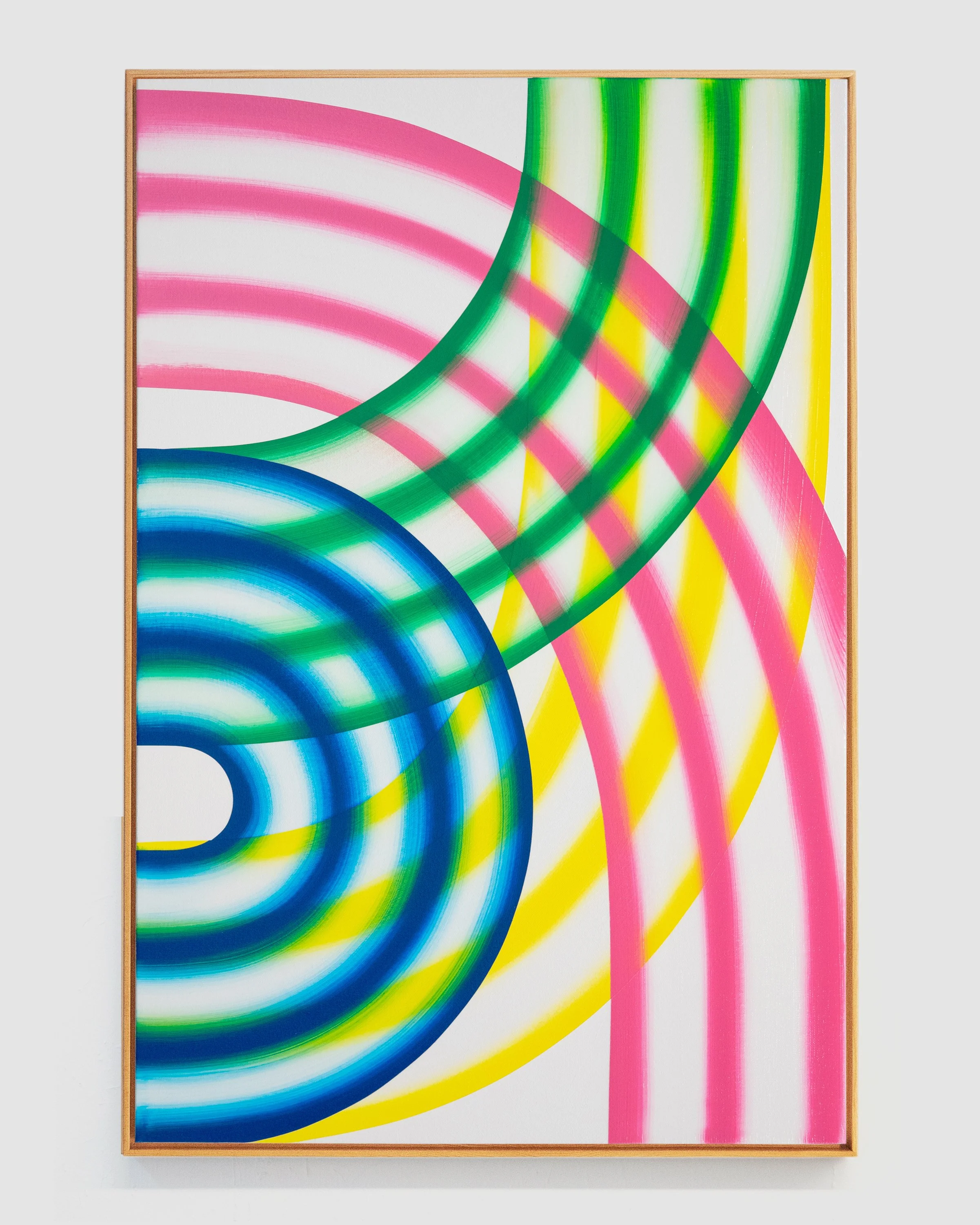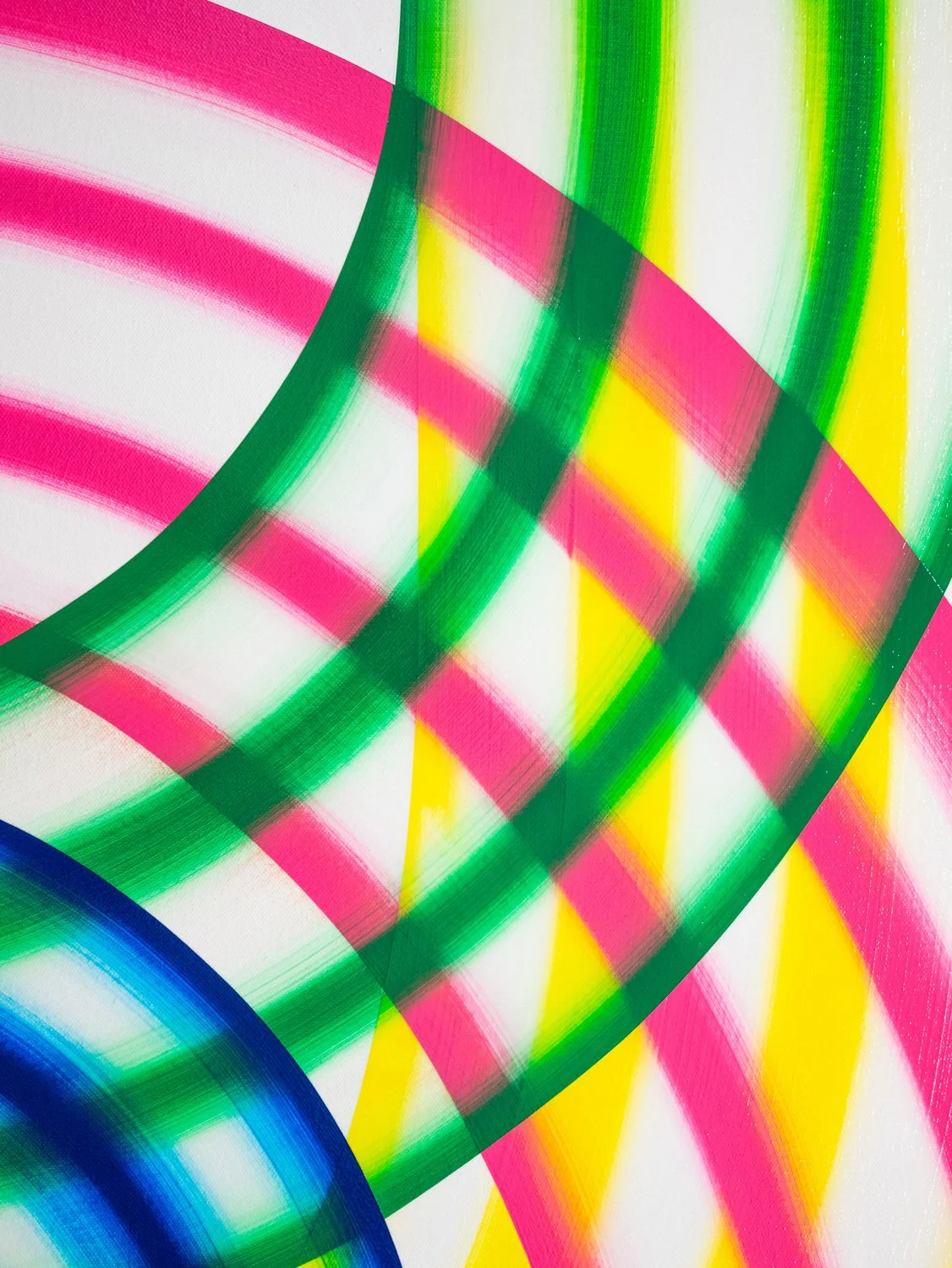 I’m drawn to forms that imply movement without depicting it directly: arcs, bands, and repeated linear structures that generate both rhythm and restraint. While each composition may begin with a loose framework, the process is largely intuitive and responsive. Decisions are guided by the behavior of color, how it absorbs, reflects, and vibrates in relation to surrounding tones.