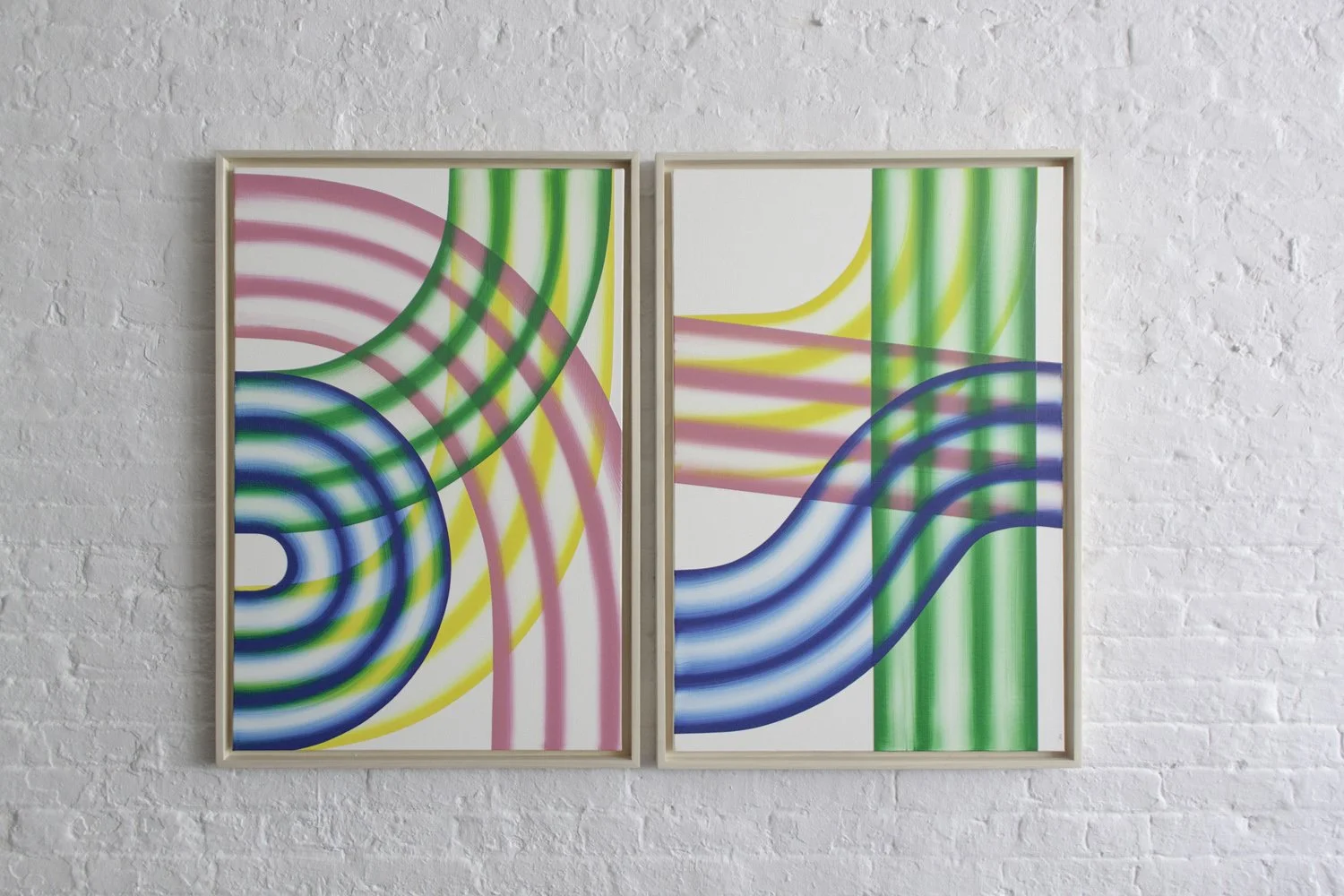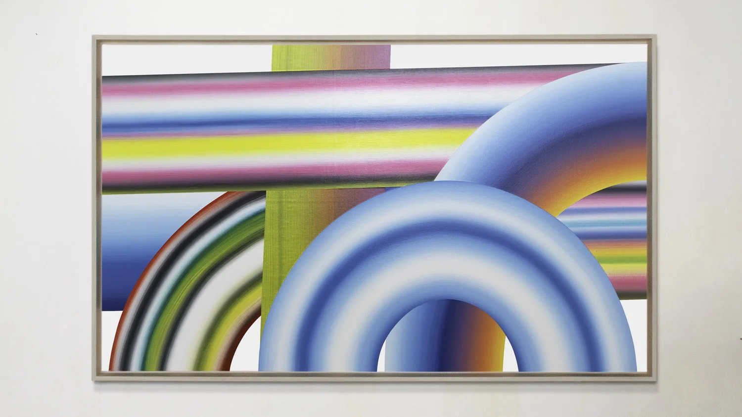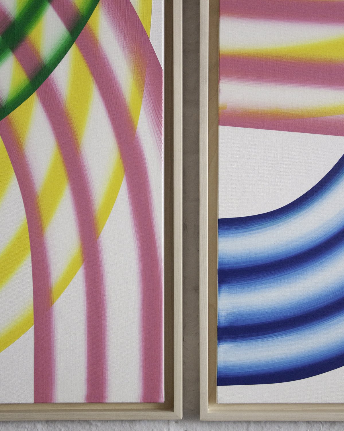 “These paintings explore the perceptual and spatial effects of color through hand-painted gradients and overlapping forms. Working with acrylic, I build each surface gradually, allowing subtle shifts in hue and transparency to suggest light in motion—where edges dissolve, boundaries soften, and space becomes elastic.